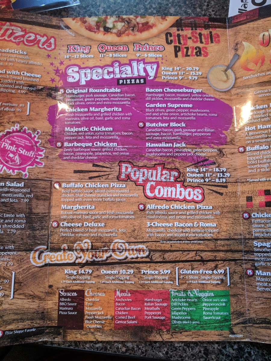 Prince Specialty options featuring Roundtable, Butcher Block, Garden Supreme, Hawaiian Jack, Bacon Cheeseburger, Chicken Margherita, Majestic Chicken, BBQ Chicken, and choice of single toppings.